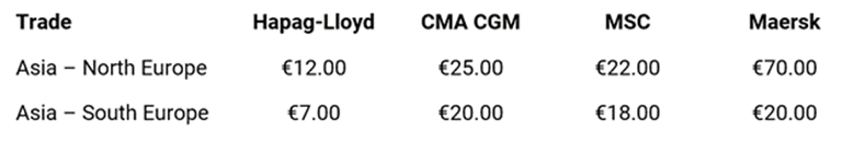 The carbon price is based on the price of EU Allowances and the scope of coverage. As the EU Allowances are based on a cap-and-trade system, the prices are subject to change. Depending on the shipping company, their vessel setup, and their sailing schedules, the EU ETS amount can differ, even on the same route. Several carriers have already given indications of the expected cost impact per tank container, as indicated in the table below for two example trades.